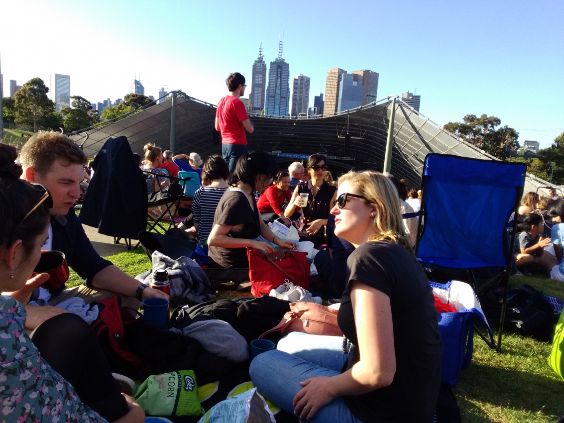 Sat, 20-Feb-2016: A wondrous sunny day in Melbourne. After dumplings we decided to go to a rooftop beer garden. Hard to resist on such a nice day, but persisted with the waters. Beers on tap were not among my favourites, which made it a bit easier. We later went to a free concert put on my the Melbourne Symphony Orchestra and Patto had the wine thermos at the ready! Everyone around has a beer. I’m realising how deeply ingrained drinking is with the weekend/relaxing and that people do it on an almost unconscious level.