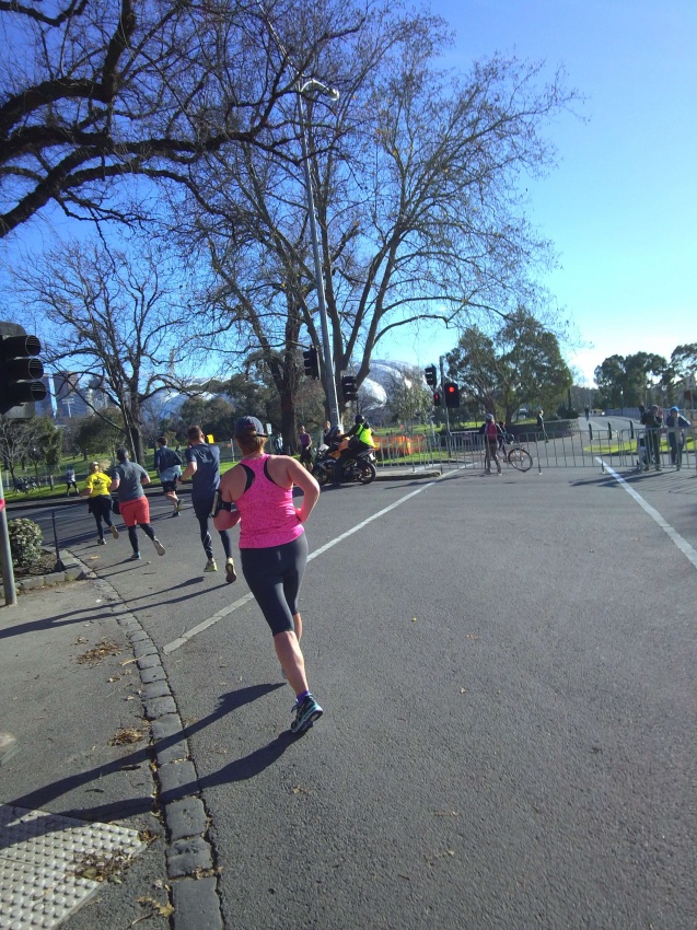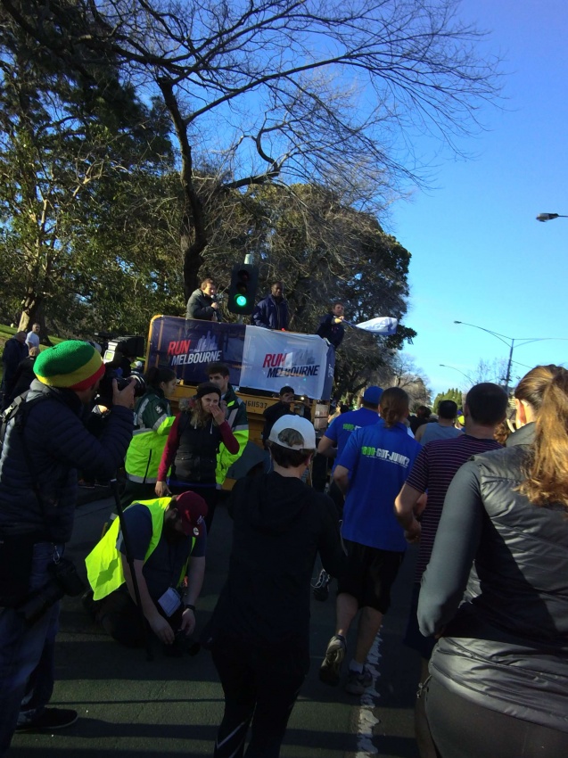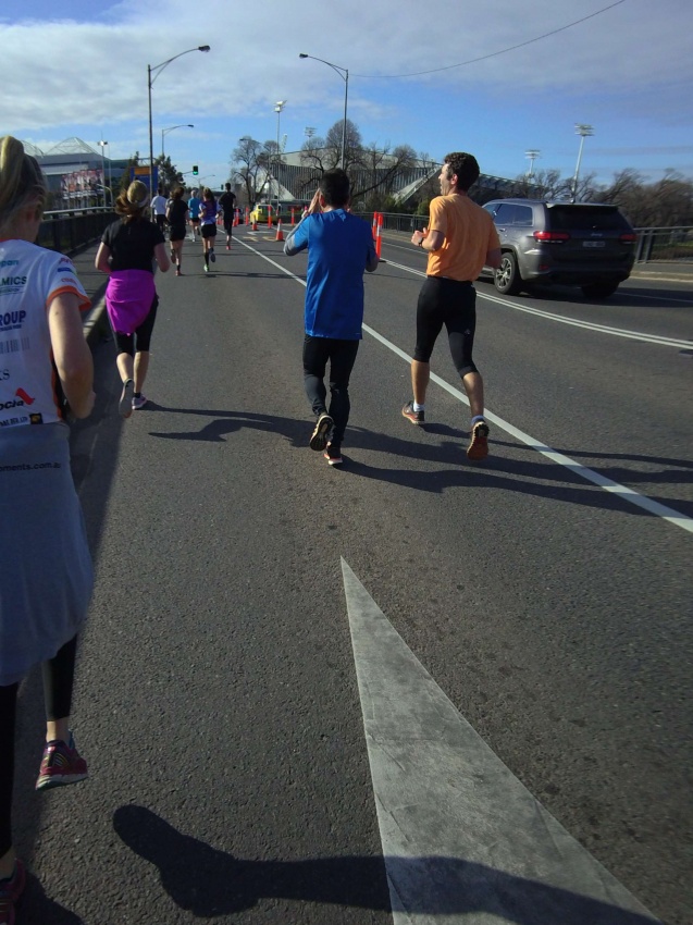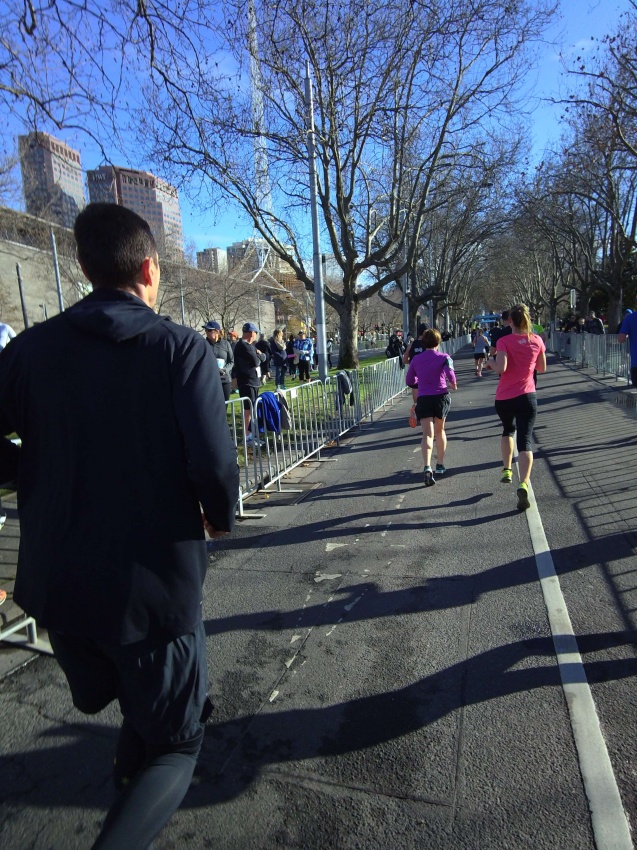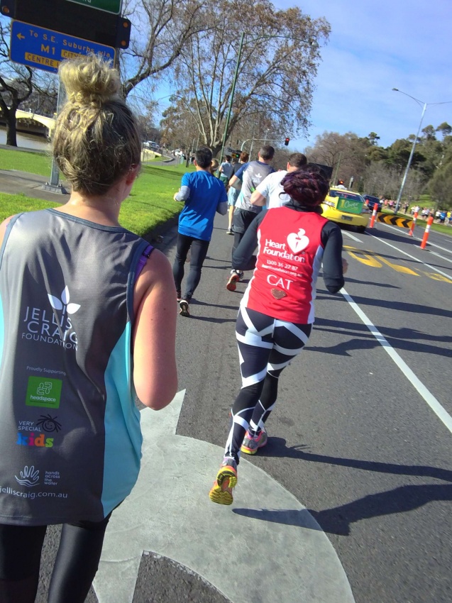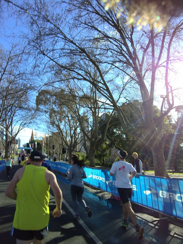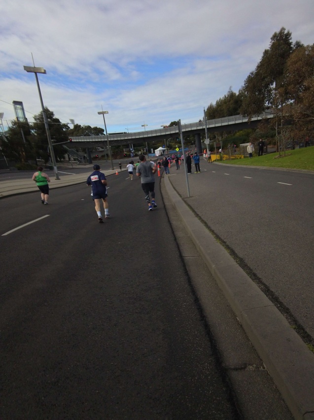 The best part of the course is always the NOVA section, with pumping music and crazy antics. This year they had a “High Five Zone”: a DJ spinning some tunes and NOVA reps wearing big red foam hands that you could high five on the way through. That section is immediately followed by the overpass bridge to the MCG; through here everybody started spontaneously yelling and pumping some noise and excitement into the course. A girl next to me saw a stray NOVA man moving in the corner of her eye and went for a inattentive high five but slapped me in the arm as I was going past. She apologized and we both immediately cracked up laughing about it.
