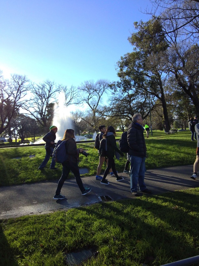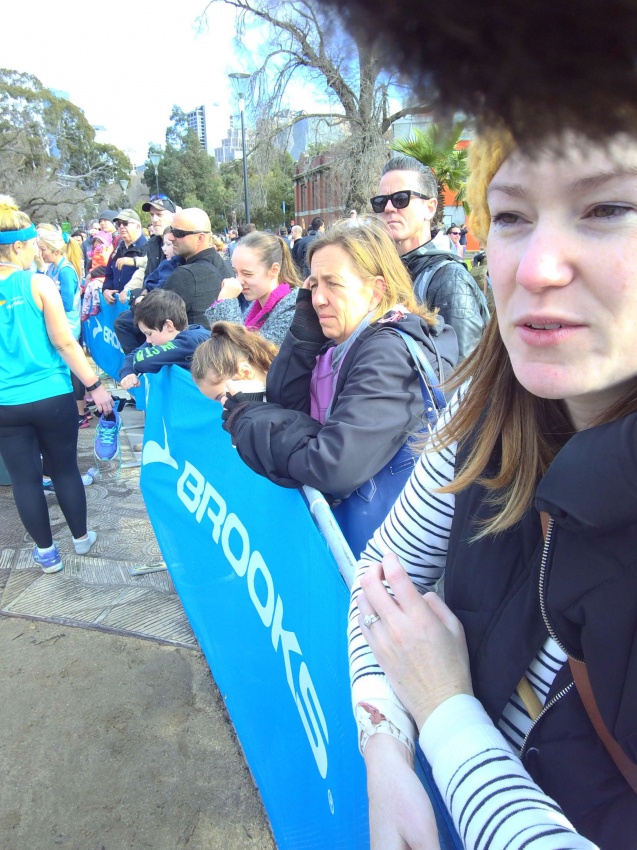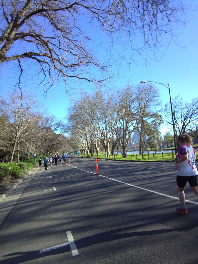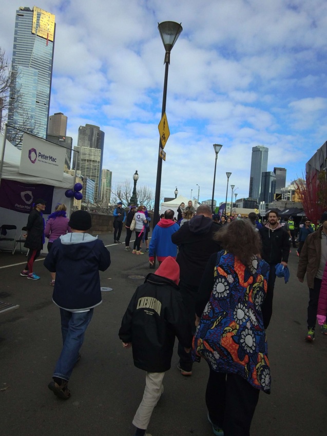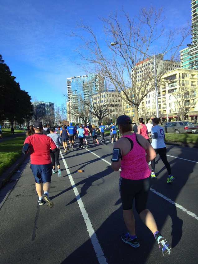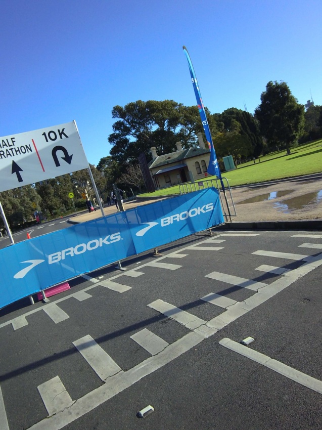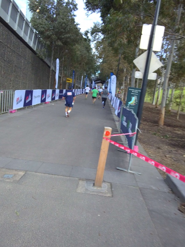The best part of the course is always the NOVA section, with pumping music and crazy antics. This year they had a “High Five Zone”: a DJ spinning some tunes and NOVA reps wearing big red foam hands that you could high five on the way through. That section is immediately followed by the overpass bridge to the MCG; through here everybody started spontaneously yelling and pumping some noise and excitement into the course. A girl next to me saw a stray NOVA man moving in the corner of her eye and went for a inattentive high five but slapped me in the arm as I was going past. She apologized and we both immediately cracked up laughing about it.