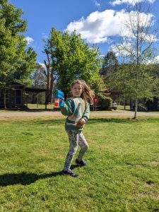 Anyway, Dad and Rachael did venture down to the pool at 1pm while Seth was napping. Rachael immediately became “The Teacher” throwing the Seal pool sinking sticks into the deeper water for Dad to dive for/fetch. Phrases “Come on!”, “Just get them!” were used many times. Rachael’s teeth were chattering as intermittent winds came through. I asked many times “are you too cold?” “Not too cold” the reply quickly came back. She then suddenly sprang up and exclaimed “Oh! I need to poo!”. We packed up and headed back to the cabin, passing an awake-and-ready-to-pool Seth with Mum.