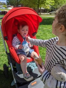 Dad/share with Seth: Peanut Butter. Sarah: Lemon and Raspberry gelato. Rachael: Smarties in Vanilla. We walked to the river, trying to desperately silence Seth’s cries and “Noooooo”‘s with spoons of ice-cream every 10 metres. Down at the river we did get another “Ooooooh!” from him at the sight of the rushing river water. We then took a look at the water splash park – Rachael loved it, but we were unequipped and had a Seth that was nearing the end of his tether. Rachael was not happy about moving on from there and swatted away my hand angrily when we went to cross the road.