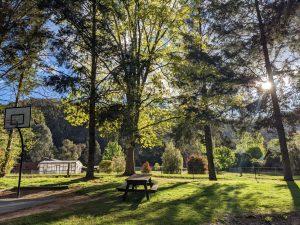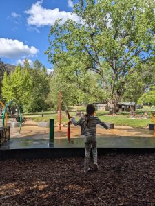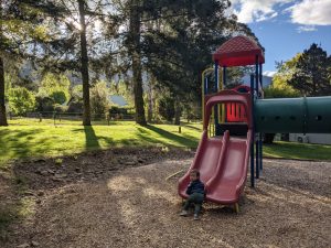 We got the key back from reception and took the kids back to the playground once Seth had a nap. The bouncing pillow was flat but Rach still had fun with some new friends. Dad was shooting some hoops. Mum and Seth on the slides. Rach was sad to leave Mila as we left for dinner & bed. She was very adventurous and go-getting, swinging Rachael high on the child swing. She also played with Tyler – the boy always on his bike around the park. We chatted to his dad Daniel (a cop who works with Bodyjar’s drummer), remarking on my Bodyjar t-shirt.
