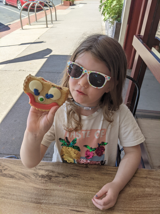 We then walked the main streets, up one side and back the other. We ducked into the bakery for a “smiley face wis sprinkles” and a danish for Seth and Mum to share. Rach was pretty excited being talked to directly by the lovely lady Jenny, and then making her request. Somehow bakeries always have the thing she is after, even when it’s a bit left field.
