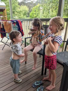I was carrying Seth, giving him a bounce on the kangaroo hopper and the other kids played “mummy”/”daddy” – involuntary tackles and shoulder hugs on the ground.